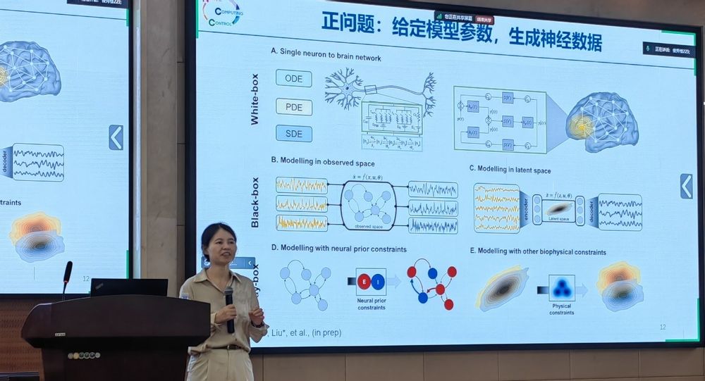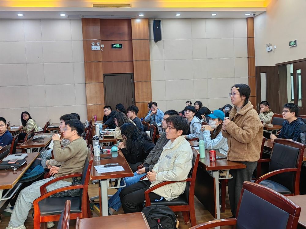 报告从动态建模、反问题求解、模型评估和实际应用四个方面展开。刘泉影教授首先介绍了如何通过数学公式定量刻画大脑的动态变化,强调基于神经数据开展动力系统构建、损失函数设计以及优化算法应用的重要性,提出从信号特征、功能实现和行为表现三个层面验证模型准确性的科学方法,并展示了如何利用该模型进行大脑活动的模拟和观察。刘泉影教授介绍了其团队的两大研究方向:一是通过数据驱动的建模方法,学习神经动力学底层机制,从而实现大脑仿真;二是通过优化控制理论,实现对大脑状态、功能和异常的调控。刘泉影教授的报告为我们展示了脑科学研究在人工智能时代的重要发展趋势。报告结束后,刘泉影教授与师生们就报告主题展开了深入的讨论,详细解答了听众提出的相关问题。