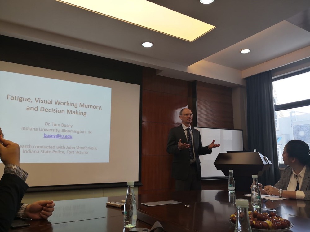 2019年11月6日上午,美国印第安纳大学认知科学、心理与脑科学学院的Thomas Andrew Busey教授到访心理与认知科学学院,并在俊秀楼305室为师生做了题为“Fatigue, Visual Working Memory, and Decision Making”的学术报告。中国政法大学证据科学研究院刘世权博士、上海市和南京市的公安系统技术工作人员、以及我院师生参加了报告会。报告会由我院刘永芳教授主持。
