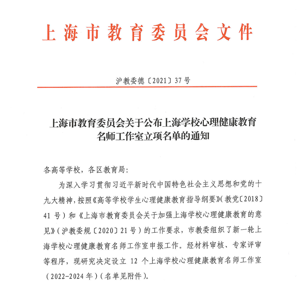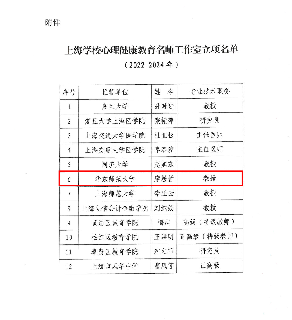 近日,上海市教育委员会公布了“上海学校心理健康教育名师工作室(2022-2024年)”立项名单。我院席居哲教授获批“上海学校心理健康教育名师工作室”。此次上海市教育委员会共设立12个“上海学校心理健康教育名师工作室”。