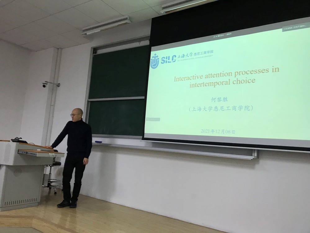 2021年12月8日下午,我院邀请上海大学悉尼工商学院副教授何黎胜博士在中山北路校区教书院 110教室,作了题为“跨期决策的交互式注意加工”的学术报告。我院2021级“心理学+计算机”双学位班以及其他年级的本科、硕士生共30余人参加了报告会。报告会由胡杨副教授主持。