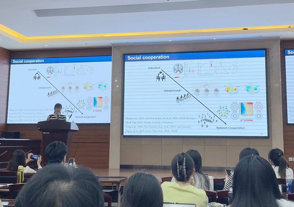 马燚娜教授还分享了课题组最近研究成果。这些研究从互动和动态的角度对社会合作进行了深入探讨。受两人三足游戏的启发,团队开发了一种新颖的合作竞赛任务,成功分解了合作的两个重要动机:人际协调和集体目标。研究采用sEEG技术,揭示了颞顶联合区和杏仁核中的高伽马振荡活动分别编码这两个动机。