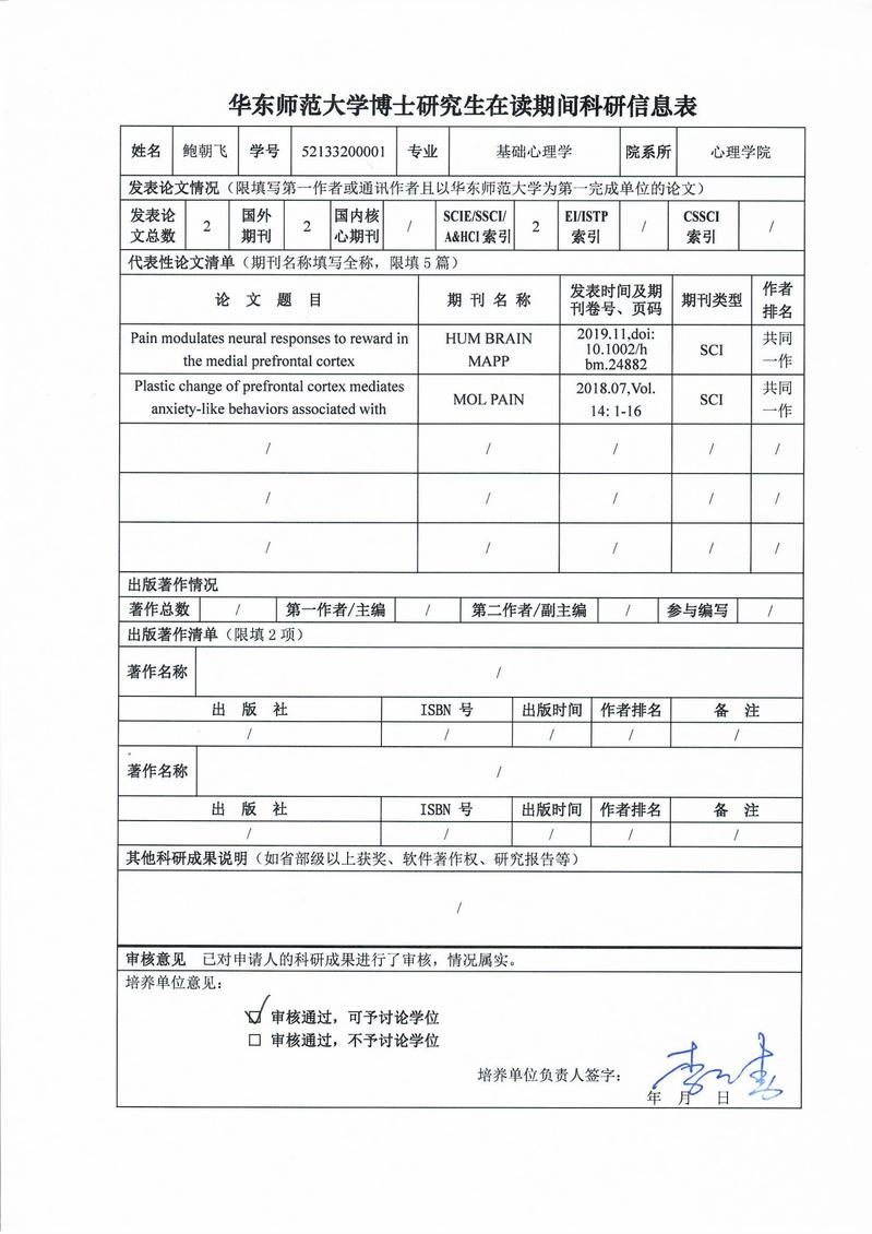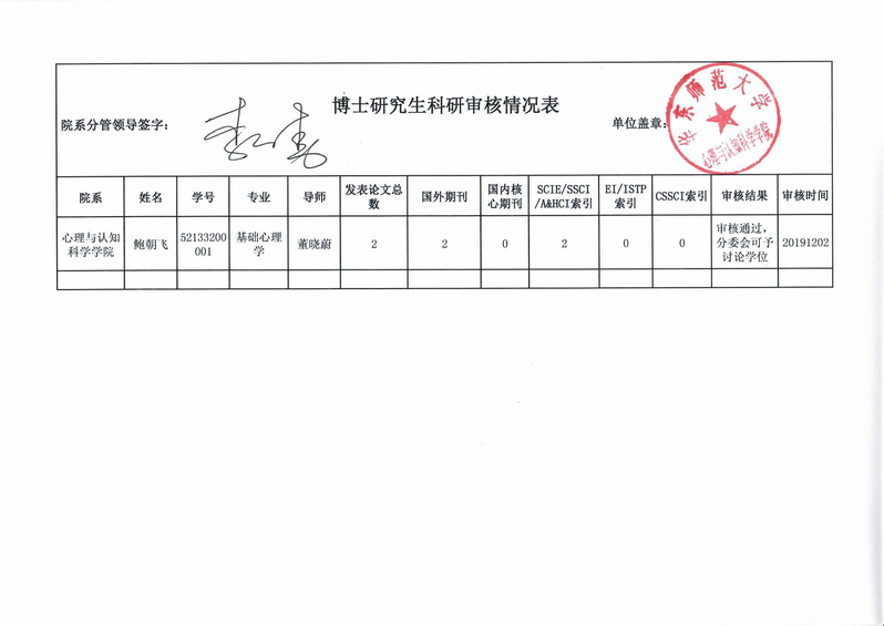 根据《华东师范大学关于2019-2020学年第一学期博士研究生科研成果审核的通知》,现将鲍朝飞博士研究生科研成果信息予以公示,公示时间为12月2日至12月6日。公示期间如有异议,请向研究生教学办公室郭老师进行反映,联系电话:62233433,办公地点:俊秀楼202室。 心理学院研究生教学办公室2019年12月2日公示文件: