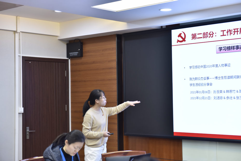 低年级博士生党支部书记张如倩讲述了一年来,支部坚持理论学习,开展党史学习教育,学习榜样事迹,践行党的宗旨,为群众办实事取得了不错的工作成效。未来将进一步提升党员的党性修养,强化支部的服务意识,主动发现身边师生的难点问题,使“我为群众办实事”落实到日常生活中。