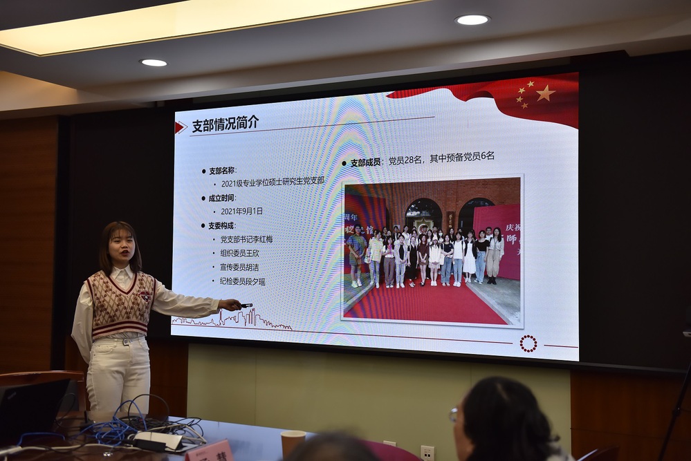 2021级专业学位硕士研究生党支部书记李红梅从加强理论学习、注重党员实践活动教育、为群众办实事三个方面讲述了工作开展情况及成效,同时也提出目前支部存在密切联系党员不足、志愿服务常态化机制缺乏、党员先锋模范作用发挥不够等问题。她表示下一步将根据问题进行整改,增加党员谈心谈话,构建志愿服务常态化机制。