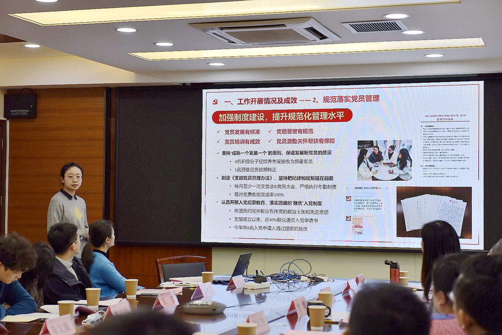 学术型硕士研究生第一党支部书记车文漪围绕扎实开展党员教育、规范落实党员管理、积极开展“我为群众办实事”活动、提升党建工作水平四个方面汇报了作为第二届全国高校“百个研究生样板党支部”创建单位的工作开展情况。针对互动交流学习有待加强、线上资源利用不够充分、“咬耳扯袖”尚未成为常态等问题,她表示下一步将充分发挥心理学专业优势,丰富组织生活形式,发挥党小组作用,提升支部凝聚力和战斗力。