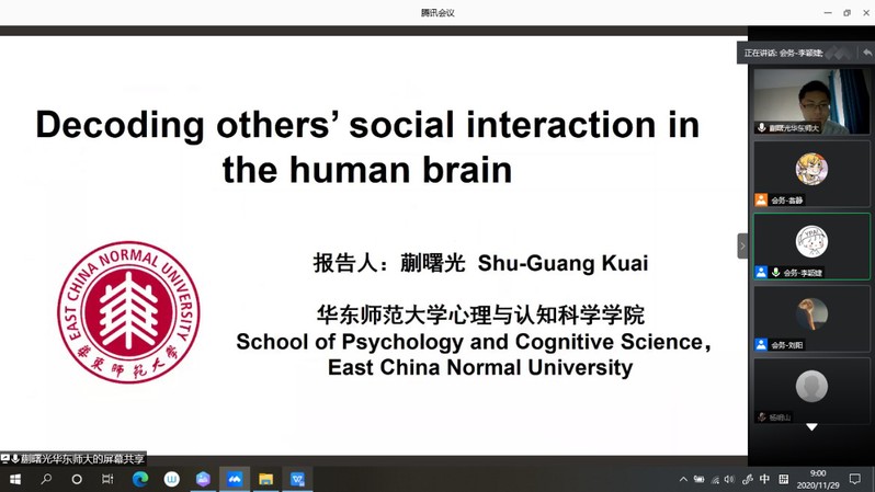 论坛的最后一个板块中,华东师范大学心理与认知科学学院蒯曙光教授做了关于大脑对他人社会交互的编码的特邀报告。上海师范大学丁雪辰副教授做了有关城市与流动儿童社会退缩的适应功能比较的特邀报告。