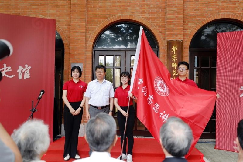 校长钱旭红为“校史馆志愿者讲解队”授旗