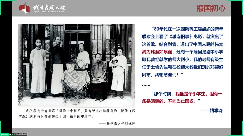 讲座中,傅强老师围绕报国初心、家国牵系、归国筑梦、党员典范四个方面生动地介绍了伟大人民科学家钱学森的一生,展现了钱学森追求真理、勇攀高峰的科学家精神和深厚的爱国主义情怀。钱学森出生在辛亥革命爆发的1911年,他的少年时代恰与中国最贫弱动荡的时代重合,爱国情怀与民族自尊心引领他少年时代就确立了科技报国之志,铭记于心,成为了他一生的驱动推力。