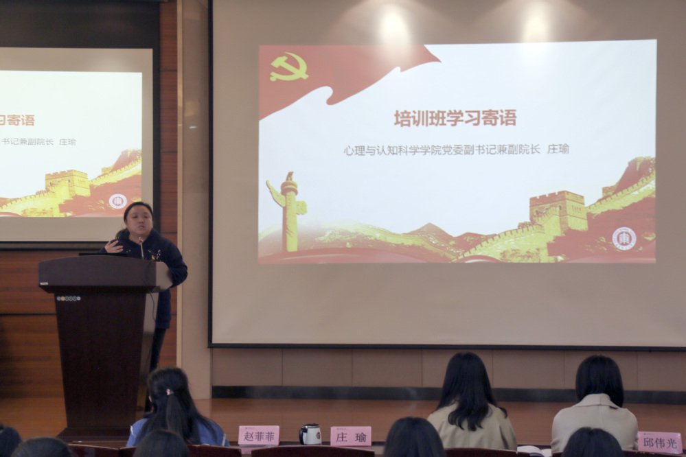 410日下午,心理与认知科学学院、国际汉语文化学院2019年入党积极分子联合培训班开班仪式暨首次培训讲座在俊秀楼小剧场举行。开班仪式由心理与认知科学学院党委秘书赵菲菲主持,心理与认知科学学院党委副书记兼副院长庄瑜、国际汉语文化学院本科生党支部书记刘曈、辅导员吴春燕出席开班仪式。