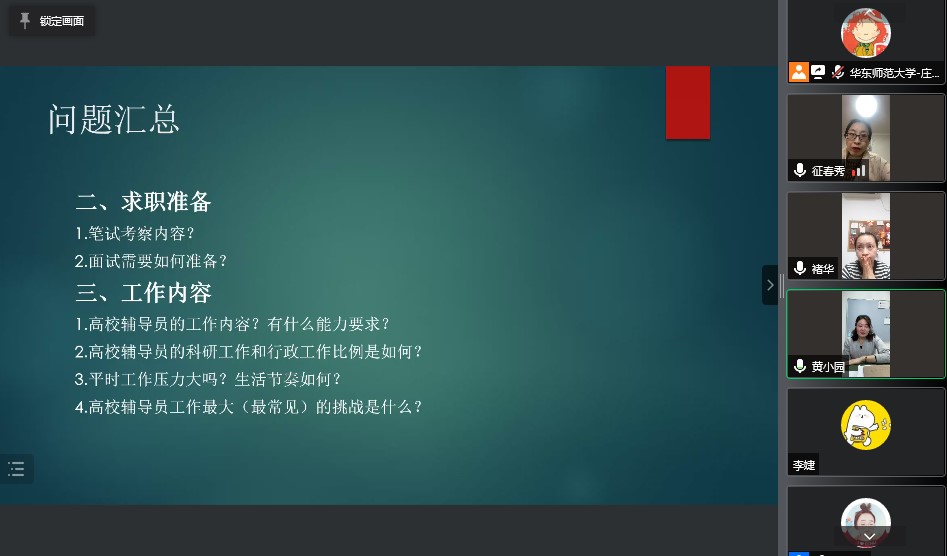 沙龙伊始,杨艳红表达了华东师范大学对于辅导员队伍建设的重视,并鼓励有志于成为高校辅导员的同学们做好规划、积极准备,实现自己的职业理想。褚华、征春秀、黄小园就同学们提出的关于辅导员招聘要求、求职准备、工作内容和职业发展等问题,结合各校实际情况,进行了详细地解答。褚华提到,作为一名辅导员,需要有较高的政治素养和良好的道德品行,要热爱学生工作和教育事业,同时还要有一定的组织管理和文字表达能力。征春秀向同学们介绍了高校在招聘辅导员时的流程与考察要点,她还提醒大家要多关心时事热点,学习党的最新文件精神等,有很大帮助。黄小园在介绍辅导员工作时谈到,辅导员工作涉及的方面很多,需要有耐心、细心和一定心理承受能力。但同时,这也不失为一个锻炼、成长的机会,可以为以后自身的发展打下基础。