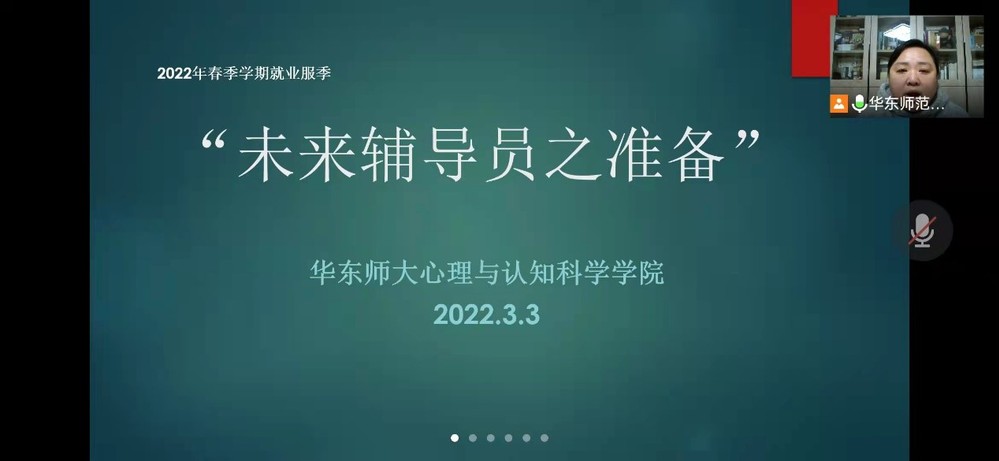 202233日,心理与认知科学学院在线上举办了“未来辅导员之准备” 分享沙龙。沙龙邀请了上海财经大学学工部部长褚华、华东理工大学党委学生工作部副部长征春秀和华东政法大学学工部德育办辅导员队伍建设负责教师黄小园三位嘉宾进行分享,华东师范大学党委学(研)工部副部长杨艳红出席了本次会议。院党委副书记兼副院长庄瑜主持,共有80余位心院学生于线上参与。