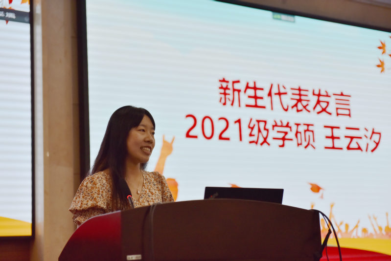 2021级应用心理学学硕研究生王云汐作为新生代表发言。她以“期待”为主题,分享了自己对于研究生生活的展望。她倡议同学们积极投身于研究创造事业,关心国家利益,找到具有社会意义的学术方向。同时,她还讲述了自己在海南省华东师范大学澄迈实验中学的实践经历,呼吁同学们知行合一,踏上更加生动的实践道路。