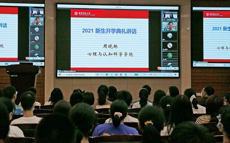 心理与认知科学学院名誉院长周晓林通过线上方式,首先对2021级新同学的到来表示热烈的欢迎。他从40年前自己在师大心理学系求学时的老照片讲起,鼓励同学们坚定志向,在各类实践中锻炼创新能力、提升思维高度。当前社会对心理学人才的需求不断增加,也对同学们提出了更高的要求。周院长尤其指出,同学们要胸怀祖国,勇于担当,努力奋斗,为建设祖国贡献力量。