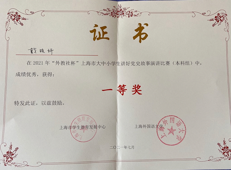 2021年7月,我院2017级本科生戴晓妍参加“外教社杯”上海市大中小学生讲好党史故事英语演讲比赛,在外语学院赵朝永老师的指导下,喜获本科组一等奖。
