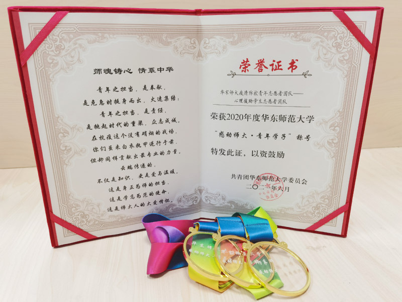 为庆祝中国共产党成立100周年,迎接华东师范大学建校70周年,共青团华东师范大学委员会于6月9日晚18时30分在中山北路校区科学会堂举办“青春心向党·点赞好榜样”颁奖典礼。我院心理援助学生志愿者团队荣获2020年度“感动师大·青年学子”人物团体表彰。