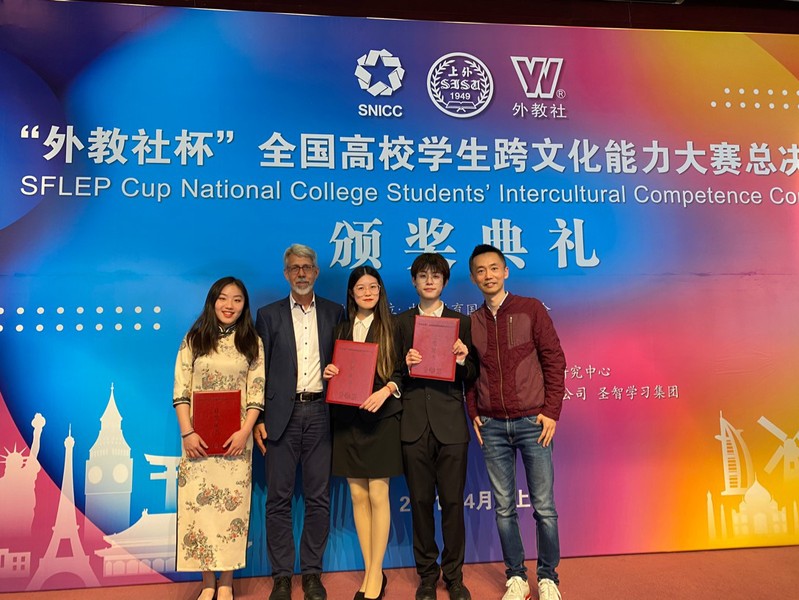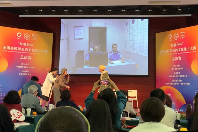 本次“外教社杯”全国高校学生跨文化能力大赛由中国教育国际交流协会指导,上海外国语大学主办,上海外语教育出版社承办,上海外国语大学跨文化研究中心提供学术支持。经过校园选拔赛、省市选拔赛,最终来自全国各地的20支队伍进入全国赛决赛。全国赛决赛包括案例展示分析、回答评委问题以及解读跨文化相关名言,总决赛包括文化知识问答、情景评述和问答以及中国故事讲述。在强手如林、竞争异常激烈的总决赛中,在跨文化语境下,我院学生表现出极强的分析与解决问题的能力,最终获得了优异成绩。