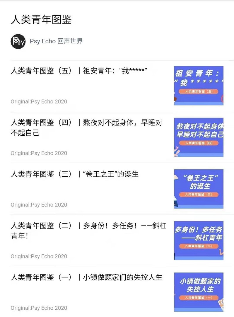 2021年的寒假社会实践项目中,Psy Echo电台聚焦于新时代青年群像,开展了寒假系列特别节目——人类青年图鉴。电台围绕主题共推出了8期相关节目,分别为小镇做题家,斜杠青年,社恐人,时差领主,卷王之王,祖安老哥,嗑学家以及搞钱机器,为的是向听众展示新时代青年独特的心理面貌,呈现时代代表性的心理特征,呼吁大家以新兴的眼光看待青年群体的社会百相。