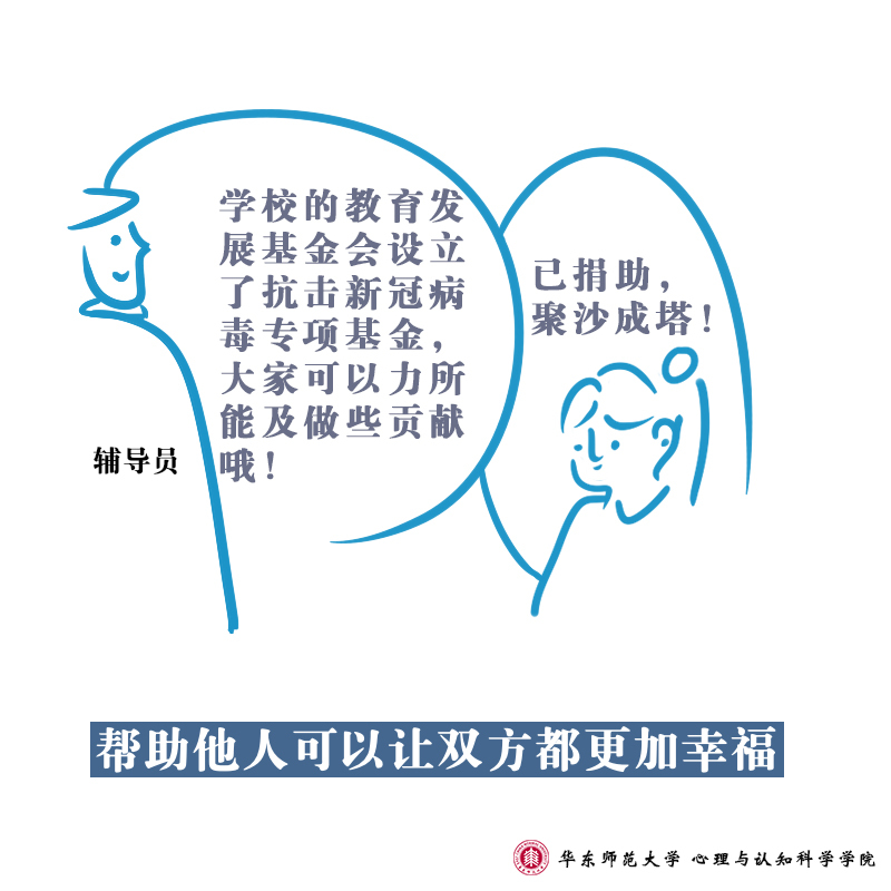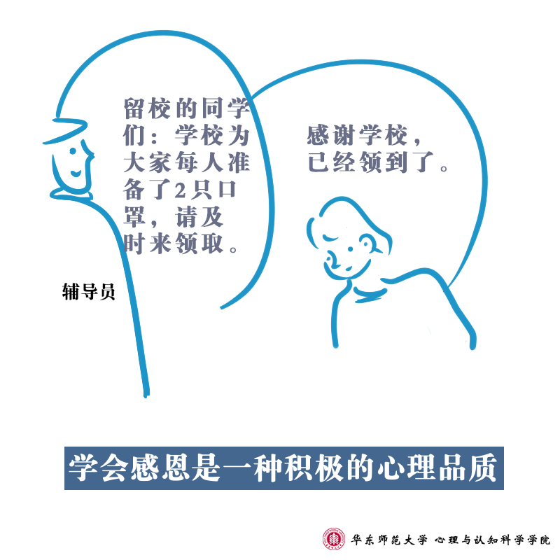 在面向全社会提供疫情防控心理支持的同时,华东师范大学心理与认知科学学院的师生们也通过手绘形式,向大家进行心理学知识的科普:防疫工作中,高校辅导员们每天与学生保持联系,全面了解学生的身体状况、动向并发布各类通知,系列所描述的是师生之间的互动行为所呈现的心理学意义。