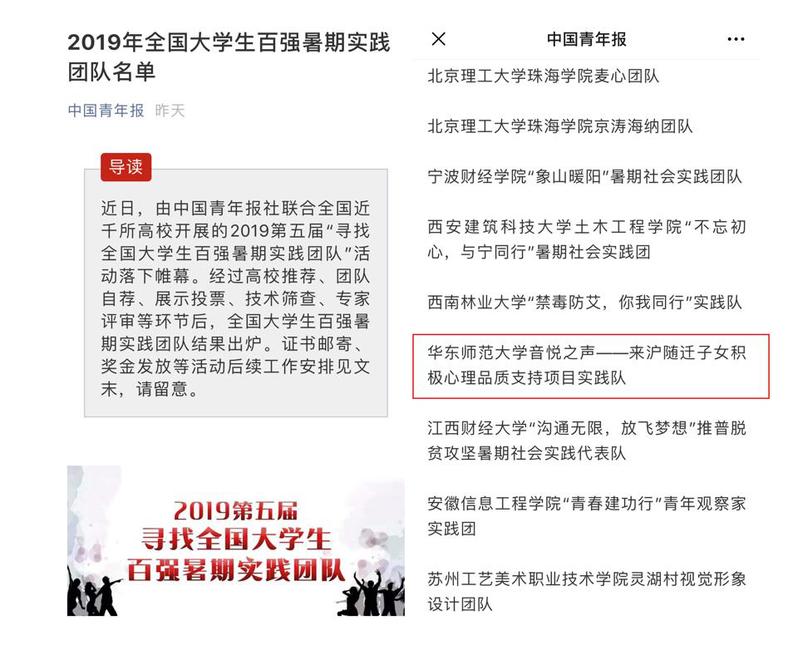 近日,由《中国青年报》组织的第五届“寻找全国大学生百强暑期实践团队”活动落下帷幕。经高校推荐、专家评审等环节,我院 “音悦之声——来沪随迁子女积极心理品质支持项目实践队”获评“全国大学生百强实践团队”。