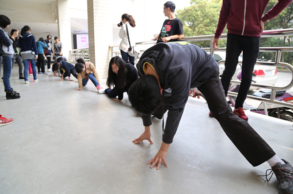 而后,第一轮胜利的绿队不幸中签(任务点与任务点之间也有抽签形式的小惩罚:花式走路法)整队被要求扭腰摆臀状走向第二站——田楼。“人体桥”环节开始!考验韧带和腿长的时刻到了,大家明明知道有着高个子队员的红队会是赢家,却还是咬牙坚持着。大长腿这一刻发挥了历史性的作用!大多数同学面部狰狞却依旧咬牙坚持,周倩楠和曾柏然同学虽然韧带柔韧但最终以微妙的差距落后有长腿队员的红队。