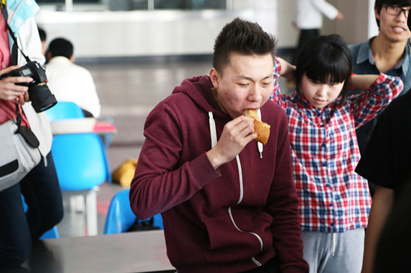游戏由“疯狂吃食”作为开始。北京时间13:35,大家浩浩荡荡地来到空荡荡的河西食堂,准备展现吃活本性或是美好吃相。短暂的分工后,开始了吞咽比赛,每桌陈列食物五枚,哪一组在最短时间内吞完就算胜利!游戏期间,无论是大长腿留学生还是可爱的萌妹子都展现了从未示人的豪爽性情。在欢声笑语中,我们见识了孙婧雯同学的一秒褪蛋壳技术,也发现了柏子学长对于面包的真心喜爱,也明白了细嚼慢咽的难能可贵。第一任务点顺利结束!