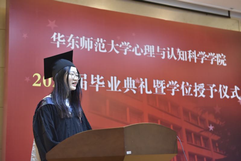 博士生代表、本硕博均就读于我院的齐芳珠谈到,十一年的学习时光,华东师大见证了自己的改变与坚守,她认为师大赠予了学子们温柔与力量,希望心理学子们能将这份温柔与力量传递下去,无论未来是否从事科研工作,都能不忘初心,求实创造;无论未来是否为人师表,都能俯仰之间,无愧于心。