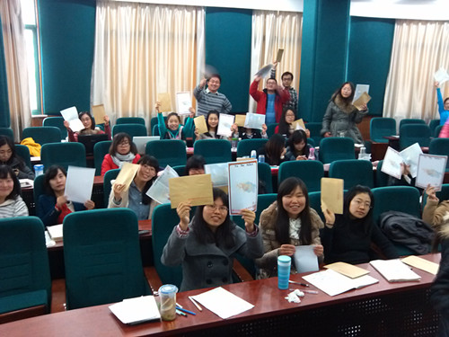 两次活动的模式一致,首先由团支书的介绍开场。本次团日活动是第一次以团支部身份主持,自主创设、宣传、组织的活动,旨在呼吁支部团员好好思考当下,更要为今后做好打算,带着目标充实地、完整地度过研究生生活,拥有一个美好的未来;并且活动精神将贯穿整个研究生生活,在毕业的时刻,团支部会将信回赠于团员——回首这几年的研究生历程,将会有意想不到的收获,对人生有新的启发。听完团支书生动讲解并观看宣传画报后,同学们收到团支部精心制作的两款印有“华东师范大学”、“心理与认知科学学院”、“12级研究生团支部”等标志的信纸,以及心理学院专用信封。大家反响激烈,热情高昂,纷纷上前领取信纸和信封。最后,同学们进行了合影留念,大家表示,会认真的思考和写好这封信,完成这次有意义的团日活动。收集信件的时间定在了一周之后,信件将由团支部秘密保管。