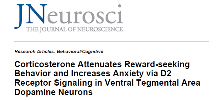 Peng, B., Xu, Q., Liu, J., Guo, S., Borgland, S. L., & Liu, S*.(2020). Corticosterone Attenuates Reward-seeking Behavior and Increases Anxiety via D2 Receptor Signaling in Ventral Tegmental Area Dopamine Neurons. Journal of Neuroscience. doi: 10.1523/JNEUROSCI.2533-20.2020.