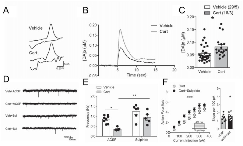 图4 皮质酮引起中脑腹侧被盖区多巴胺含量升高,舒必利能恢复多巴胺神经元兴奋性及其兴奋性输入