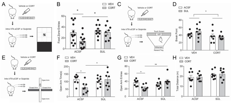 图5 微量注射舒必利至腹侧被盖区能够恢复奖赏搜索行为并降低焦虑样行为