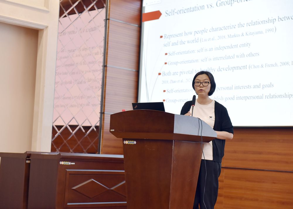 随后,来自美国戴顿大学的赵斯曼博士作题为“中国青少年自我与群体导向观念的发展及其适应功能”的报告。赵博士首先报告了她最近发表的一项纵向研究,考察中国青少年自我导向和群体导向的发展轨迹及其对青少年发展的影响。此外,自我导向和群体导向可能会影响个体如何看待和应对压力经历。因此,她随后在其报告中,还分享了一项关于青少年自我导向和群体导向如何调节同伴侵害与青少年适应之间关系的研究结果。