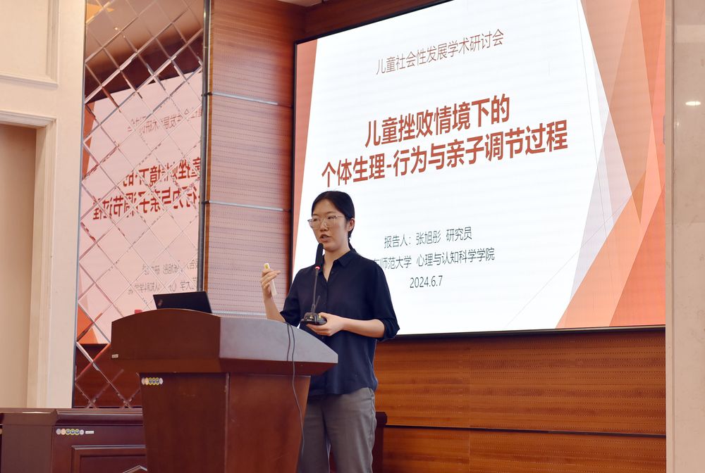 华东师范大学心理与认知科学学院的张旭彤研究员以“儿童挫败情境下个体生理-行为与亲子调节过程”为题进行了报告。报告首先进行了理论背景和相关研究的梳理,介绍了在儿童挫败情景的应对方式的习得过程中,家长的调节作用对于儿童适应性发展的意义。报告人基于行为层面和生理层面两个角度,分别介绍了儿童的调节行为与家长的回应之间的双向预测作用,以及儿童的调节行为与其自身通过RSA测量的副交感神经活动之间的双向关系。接着,报告人介绍了研究团队提出的从动态系统的角度出发建构的儿童行为与家长行为与内部活动之间的动态系统框架。最后,张旭彤研究员分享了课题组基于儿童挫折情景下研究亲子动态互动的最新成果,为亲子间动态调节过程供了行为和生理的证据。
