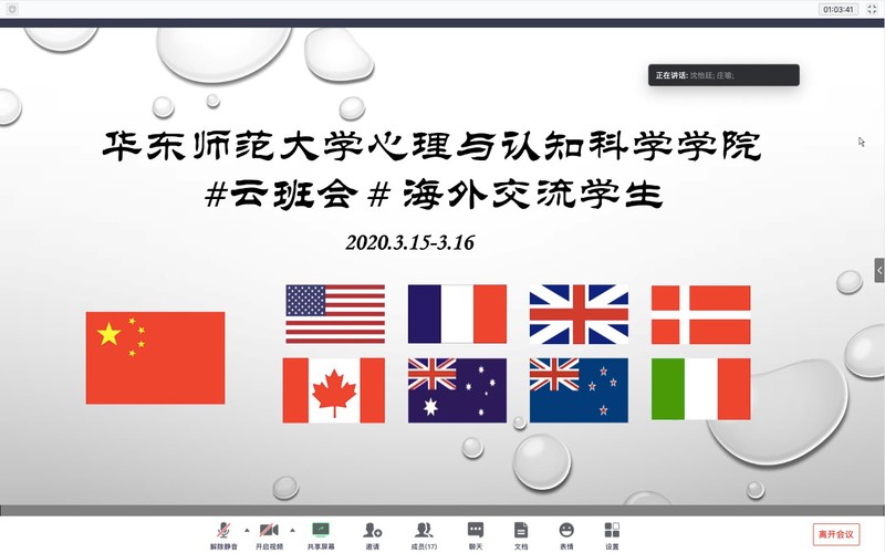 2020年3月15-16日,依据时差,心理与认知科学学院举办了两场海外交流学生“云班会”,身在8个国家的18名心院学子在云平台上相见。云班会由心理与认知科学学院党委副书记兼副院长庄瑜主持,辅导员董镕、赵菲菲、学生事务挂职干部沈怡廷一同参会。