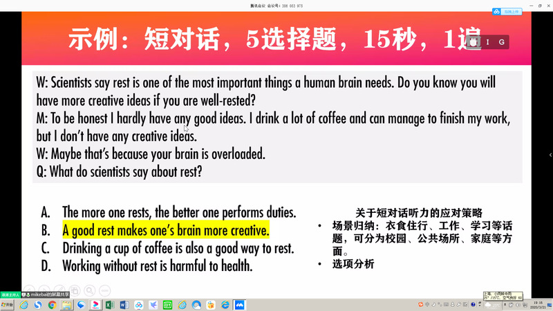 王老师首先向大家介绍了大学生英语竞赛近几年发展现状、奖项设置、题目特点与题型变化;随后针对不同的题型,介绍了具体的做题策略和备考思路;对于考试的重点、难点,王老师通过真题进行举例,耐心讲解分析过程和答题重点;培训尾声,王越老师一一解答了同学们提出的问题。