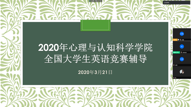 3月21日,心理与认知科学学院举办 “2020年全国大学生英语竞赛辅导线上培训”,邀请校英语学科竞赛中心主任王越老师为主讲人,我院报名参赛的69名学生中,有62名学生参加了本次培训。
