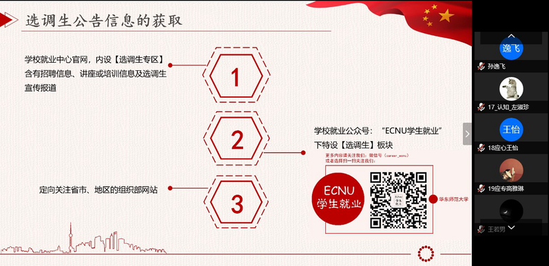 3月28日,心理与认知科学学院通过腾讯会议在线举办了“选调生政策解读与经验分享沙龙”。本次分享会邀请了我校学生职业发展中心市场信息部主管段言老师和2018级MAP吴莹同学(已入选浙江省选调生)作为嘉宾,为同学们解读选调生政策,分享基层就业经验,七十余名同学参与本次活动。