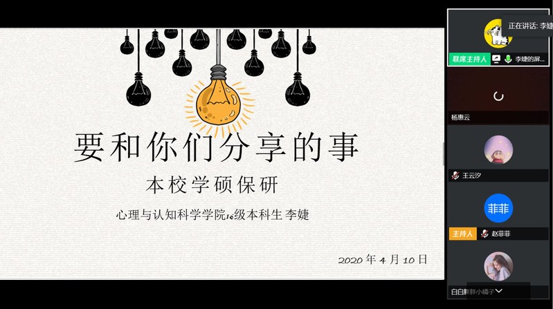 4月10日,心理与认知科学学院通过腾讯会议APP,面向全体本科生举办了就业服务月的系列活动——“保研&出国留学经验分享会”。
