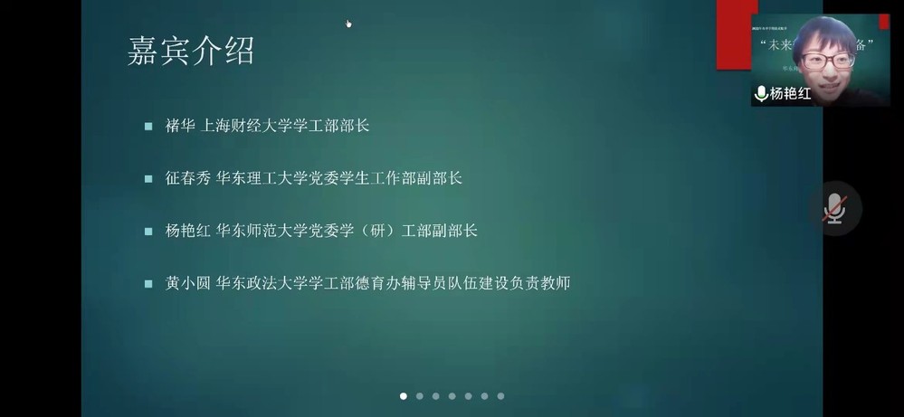 2022年3月3日,心理与认知科学学院在线上举办了“未来辅导员之准备” 分享沙龙。沙龙邀请了上海财经大学学工部部长褚华、华东理工大学党委学生工作部副部长征春秀和华东政法大学学工部德育办辅导员队伍建设负责教师黄小园三位嘉宾进行分享,华东师范大学党委学(研)工部副部长杨艳红出席了本次会议。院党委副书记兼副院长庄瑜主持,共有80余位心院学生于线上参与。