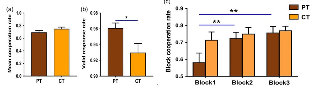 行为结果发现,尽管整体的合作率在两组被试间没有差异(图2a),但疼痛个体对任务反应更集中(图2b),并且随时间先后增加了合作率(图2c)。