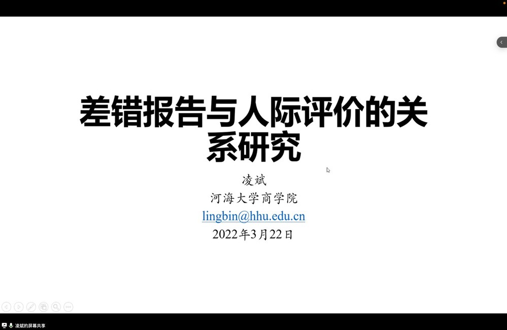2022年3月22日,华东师范大学心理与认知科学学院举办的俊秀青年学术俱乐部系列讲座如期举行。河海大学商学院凌斌副教授应邀以“差错报告与人际评价的关系研究”为主题,通过腾讯会议的方式与所有参会者交流互动。本次讲座由华东师范大学心理与认知科学学院的段锦云教授主持。约五十位对此研究感兴趣的老师和同学们参与了本次讲座。