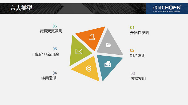 邱小波还介绍了六大创新种类,即开拓性发明、组合发明、选择发明、转用发明、已知产品新用途和要素变更发明。开拓性发明指一种全新的技术方案;组合发明指将某些技术方案进行组合,构成一项新的技术方案;选择发明指预料不到的技术效果;转用发明指借鉴其他技术中的技术手段;已知产品的新用途指在其他方面产生了预料不到的技术效果;要素变更指改变一项技术中的要素构成。而挖掘新专利的思路可以归为以下几点:加一加,减一减,扩一扩,缩一缩,学一学,搬一搬,反一反,定一定。