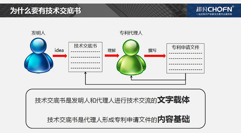 为了实现知识产权的构建,一定要有交底书。邱小波介绍了交底书的模板,并着重介绍了其中技术方案中产品结构类的描述和方法类的描述之间的差别、声明关键点和欲保护点,以及附图的关键点。