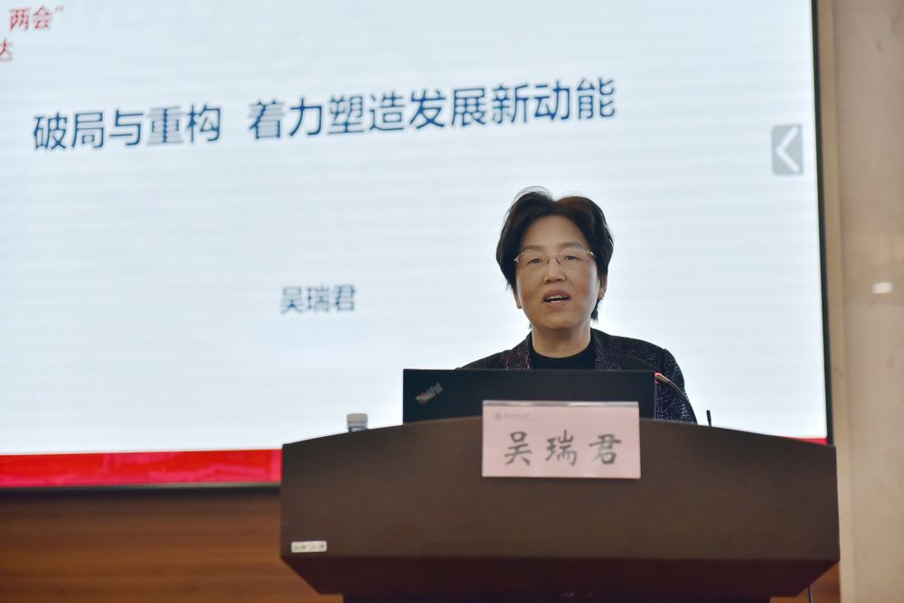 为深入学习和领会2025年全国两会精神内涵,将两会精神与学院实际工作紧密结合,进一步明确发展方向。2025年3月20日,心理与认知科学学院党委邀请全国政协委员、上海市政协常委、华东师大学图书馆馆长、华东师大学未来学习发展中心主任、华东师大老龄研究院执行院长吴瑞君教授为全院教师作“破局与重构,着力塑造发展新动能——2025年全国两会精神传达”的专题报告。报告会由院党委书记方媛主持。