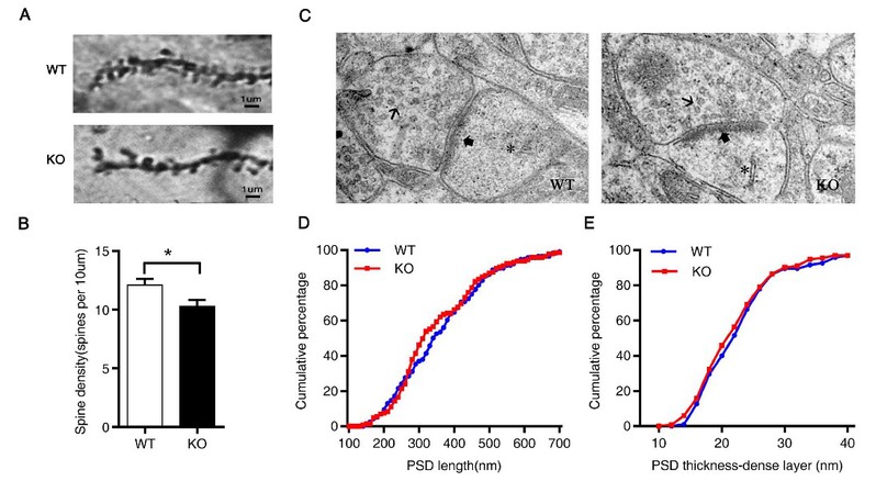 既然Sapap4基因的缺失会影响突触的分子组成,那么,Sapap4基因缺失是否会影响突触的形态和结构?研究进一步发现,Sapap4基因缺失导致内侧前额叶皮层(medial prefrontal cortex, mPFC) 锥体神经元树突棘的密度降低,但对PSD的长度和厚度没有影响(图4),这表明,Sapap4对正常突触连接的发育和维持至关重要。