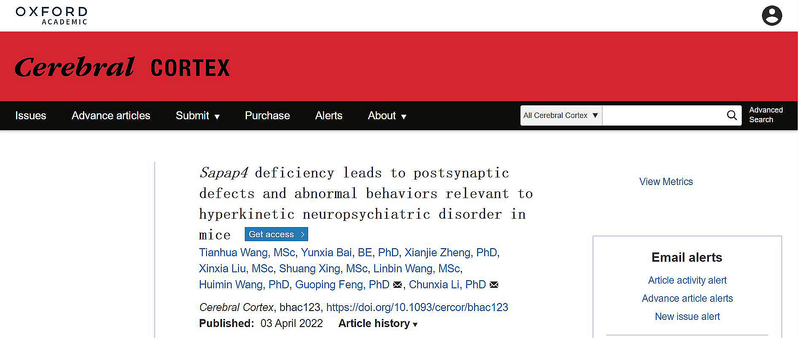 2022年4月3日,华东师范大学心理与认知科学学院李春霞副研究员及其合作者团队在国际权威期刊Cerebral Cortex(SCI,5-Year IF: 6.32)在线发表了题为“Sapap4 deficiency leads to postsynaptic defects and abnormal behaviors relevant to hyperkinetic neuropsychiatric disorder in mice”的研究论文。该论文提供了SAPAP4在突触中发挥重要作用的证据,发现了SAPAP4功能障碍与躁狂症等多动性精神障碍间的潜在关联,为理解多动性精神疾病的病理机制提供了新思路。