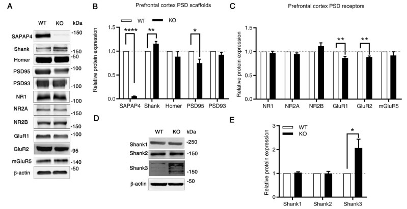 SAPAP家族蛋白作为PSD95-SAPAP-SHANK支架蛋白复合体的一部分,被认为是兴奋性谷氨酸能突触后致密区的核心组成部分。前额叶皮层(Prefrontal cortex, PFC)是SAPAP4蛋白高表达的脑区,且PFC与认知功能、精神疾病的功能障碍有关。因此,该研究检测了SAPAP4的缺失是否对PFC中突触后蛋白组成产生影响。结果发现,Sapap4基因缺失动物PFC中突触后蛋白PSD95蛋白、AMPA受体亚基(GluR1和GluR2)显著降低,而SHANK3蛋白水平明显升高(图2)。