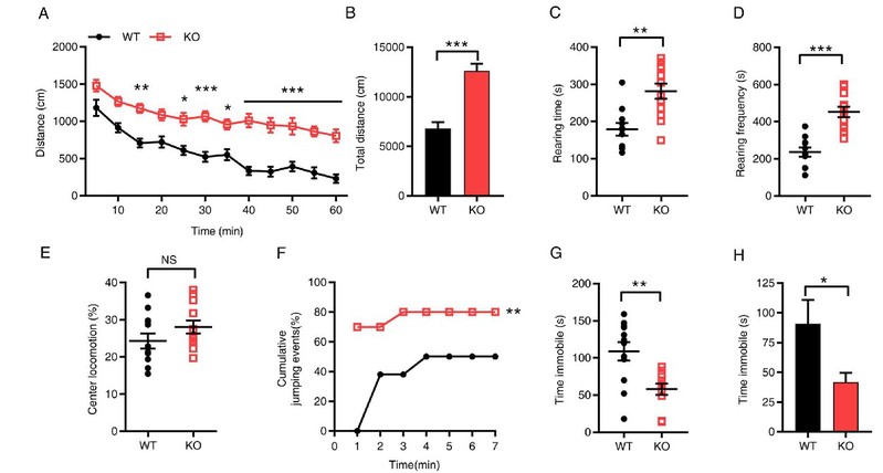 Sapap4基因缺失对神经元功能的影响在行为水平上有何体现呢?研究通过一系列行为学实验发现,Sapap4基因缺失动物在旷场实验中表现出多动行为,在悬崖躲避测试中表现出冲动行为,表明可能存在行为抑制缺陷;在强迫游泳和悬尾实验中均表现出多动和躁狂样行为(图5)。而该动物表现出的多动行为不是由新环境引起,并且其总体运动功能没有异常,也不存在焦虑行为。