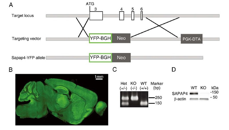 为了解Sapap4基因在大脑中的功能,该研究首先利用遗传学手段构建了Sapap4基因缺失动物,并通过实验验证了Sapap4基因在脑中的表达缺失(图1)。