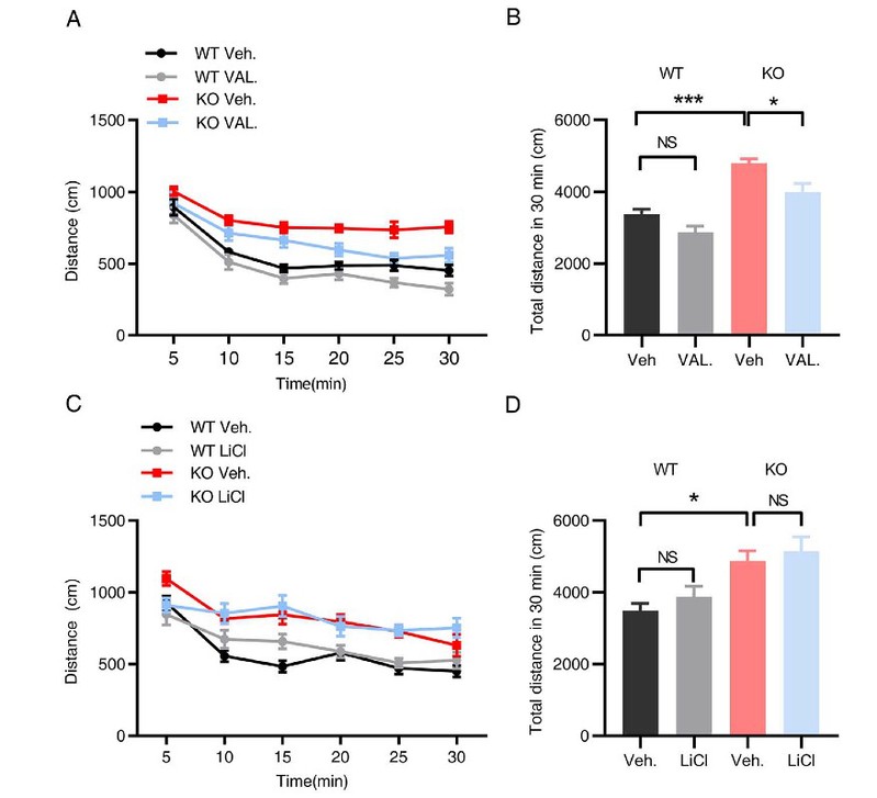 心境稳定药物如锂盐和丙戊酸钠是临床上治疗双相情感障碍最常用的药物,并已被用于缓解动物模型中的过度活跃和躁狂样行为。研究进一步测试了常用的心境稳定药物氯化锂和丙戊酸钠是否可以改善Sapap4基因缺失动物的行为异常。结果发现,丙戊酸钠显著改善了Sapap4基因缺失动物的多动行为,但氯化锂没有显著效果(图8)。