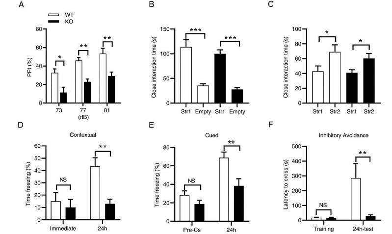 此外,研究还发现Sapap4基因缺失动物具有感觉运动门控障碍、记忆损伤等表现,但是其社会交往能力正常(图6)。